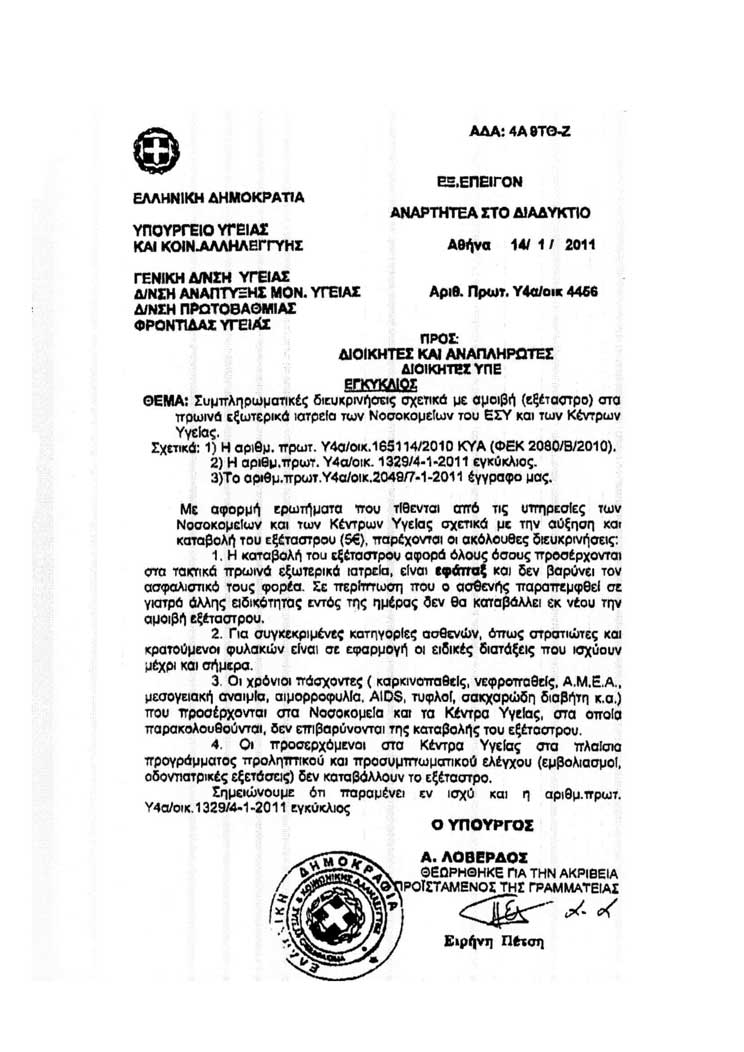 Όπως επισημαίνεται στην εγκύκλιο, «οι χρόνια πάσχοντες (καρκινοπαθείς, νεφροπαθείς, Α.ΜΕ.Α. κλπ.) που προσέρχονται στα Νοσοκομεία και στα Κέντρα Υγείας, στα οποία παρακολουθούνται, δεν επιβαρύνονται της καταβολής του εξέταστρου».